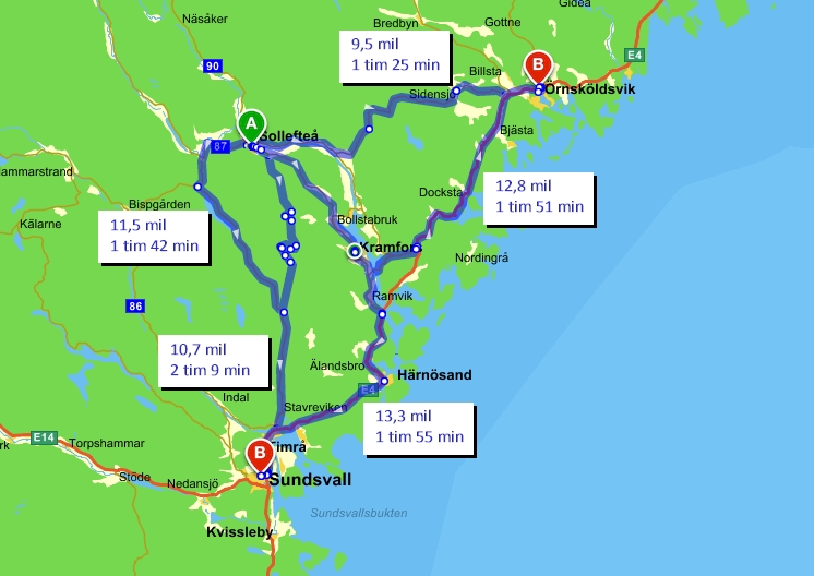 Karta för förlossning och sjukvård med resvägar och restider – utan hinder i trafiken (och högst troligt på torrt sommarväglag)