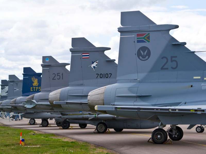 (Bilden: Gripenplan från flera nationer samlade. Foto: Tommy Olsson, PD CC0 https://creativecommons.org/publicdomain/zero/1.0/)