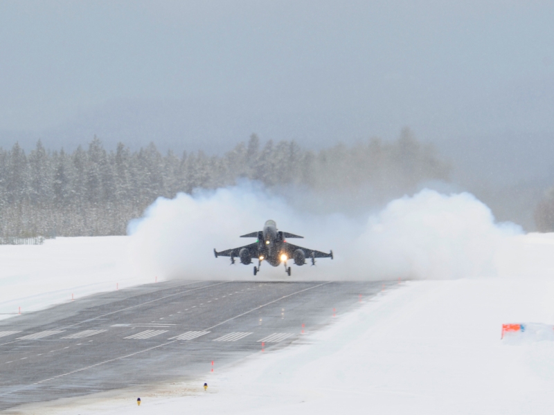 (Bilden: Start från kortbana med Jas 39 Gripen. Bilden är beskuren)