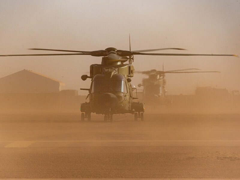 (Bilden: Danska helikoptrar för Operation Barkhane i Mali från ett tidigare tillfälle. Något beskuren bild. Foto: Forsvarsgalleriet, OP Barkhane, Forsvaret, ©James WILLIAM/armée de Terre/Défense)
