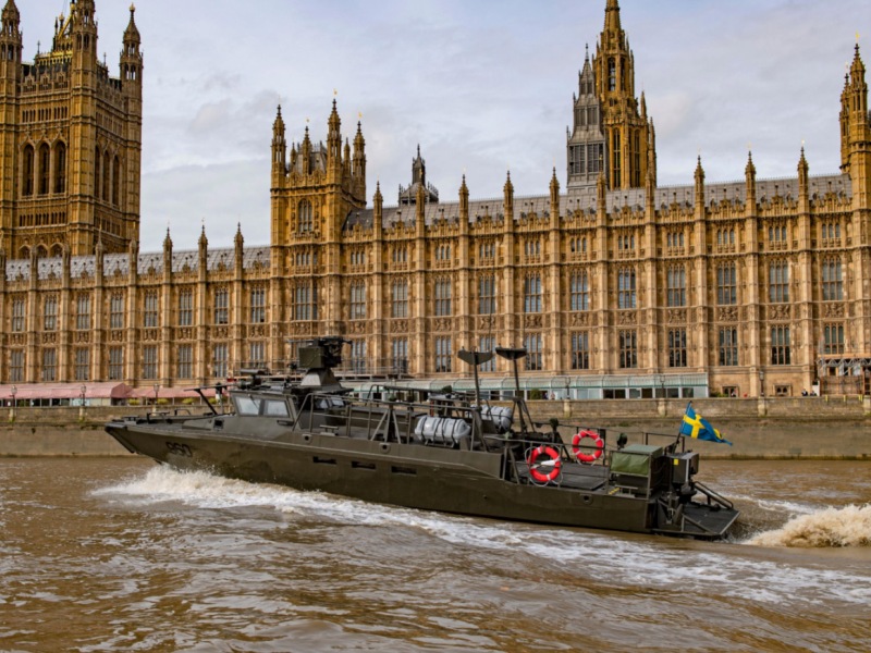 (Bilden: CB90 Next Generation passerar parlamentsbyggnaderna i London. Något beskuren bild. Foto: Jamie Hunter/Copyright Saab AB. Filmen: Saabs Youtubekanal.)
