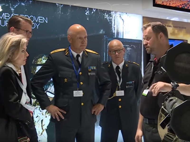 (Bilden: Celebert besök i montern, ur Eurosatory 2016 Day 4 Summary video. Courtesy Eurosatory. Filmen: Bofors Test Center, Youtube-kanal)