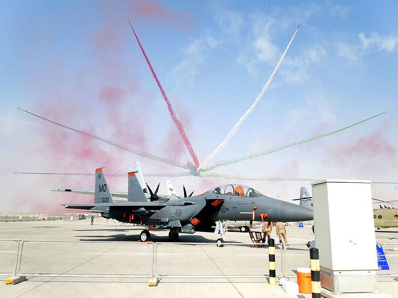 (Bilden: Förenade arabemiratens uppvisningsteam ”Al Fursan” (Riddarna) formationsflyger på Dubai Airshow 2015. Foto: Tech Sgt Joshua Strang, US Air Force, PD CC0)
