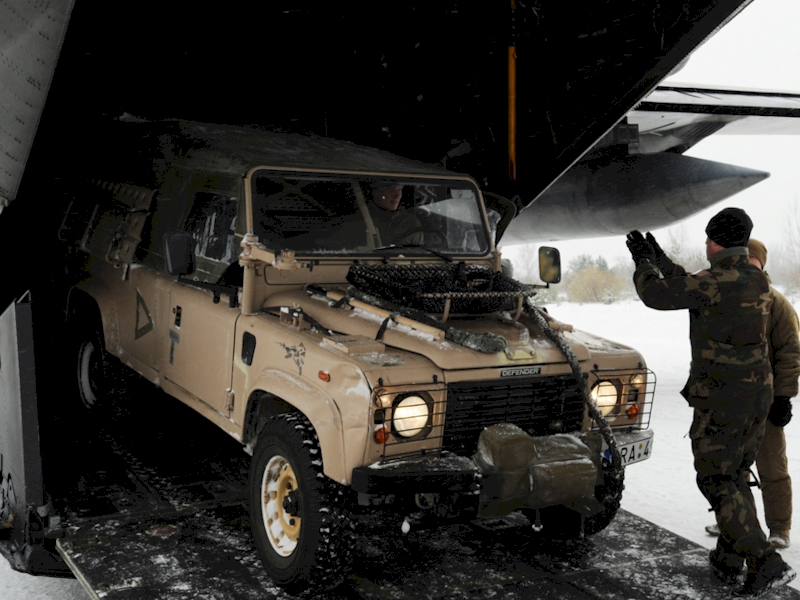 (Stora bilden: Lettiska Special Ops lastar en Defender för lufttransport. Foto US Federal PD. Lilla bilden: Koncept DC100. Foto Norbert Aepli CC BY 3.0)