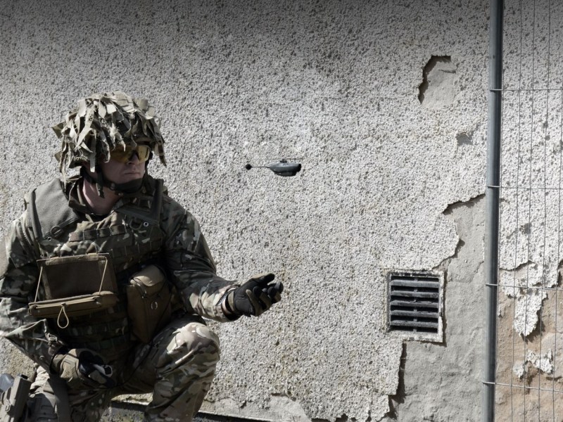 (Bilden: Soldaten skickar iväg en Black Hornet nano-UAV för en snabb och säker bild av läge/situation/förutsättningar. Foto: FLIR Unmanned Aerial Systems)