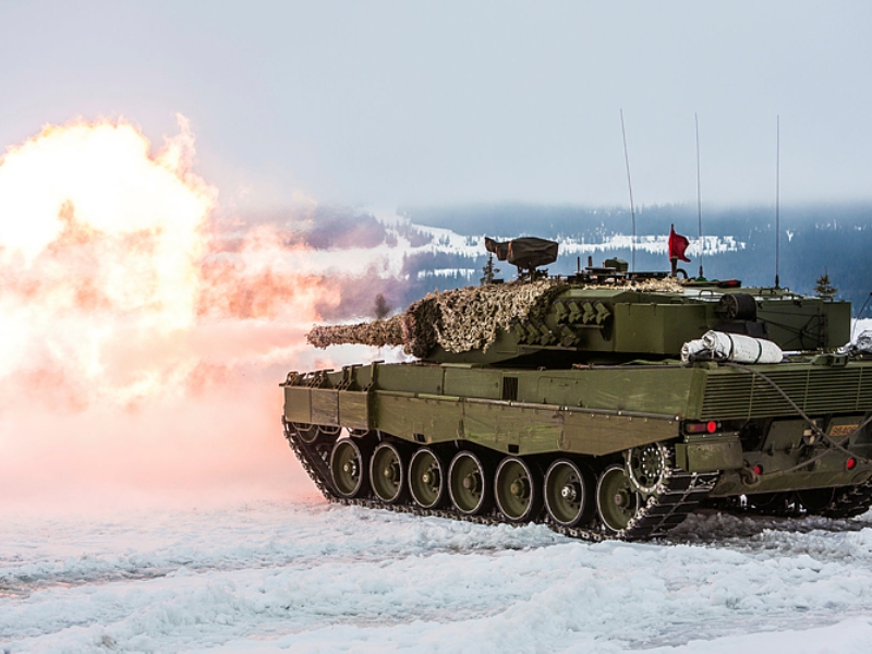 (Bilden: ”Tropp 1 i Kampeskadronen skyter skarpt med Leopard 2 stridsvogner, Regionsfelt Østlandet”. Foto: Henrik Røyne / Forsvaret.)