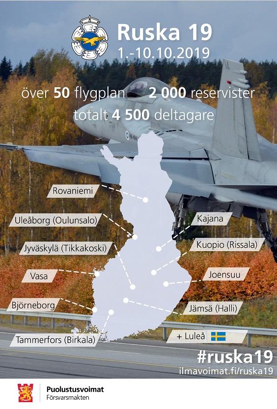 – RUSKA 19, Finnish Air Operations Exercise during 1-10 October, to engage some 50 aircraft and 4 500 soldiers. The Swedish Air Force will participate as both defending and adversary units