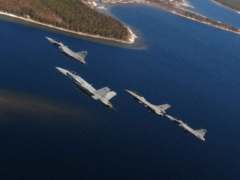 (Bilden som visar Gripen, F-16 och F/A-18 Hornet i nordiskt samarbete är från ett annat, tidigare tillfälle. Foto: Louise Levin/Försvarsmakten.)