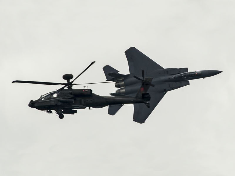 (Bild: Från uppvisningarna 2016. En F-15 SG Strike Eagle passerar en AH-64D Apache Longbow från Singapores flygvapen resp armé. Foto: US Air Force, Capt Raymond Geoffroy/Released.)