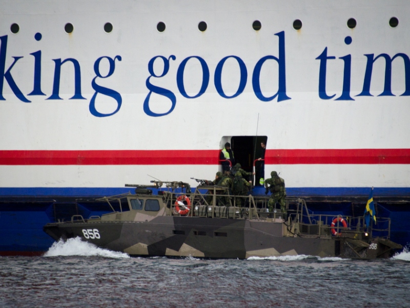 (Bilden är från ett annat, tidigare tillfälle med övning i eskort av färja. Något beskuren bild. Foto: Carolina L Nilsson/Försvarsmakten.)