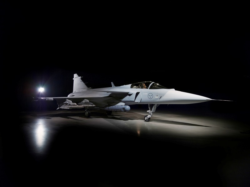 (Bilden: Från premiärvisningen av nya Saab Gripen E. Foto: Robert Sullivan, Copyright Saab AB.)