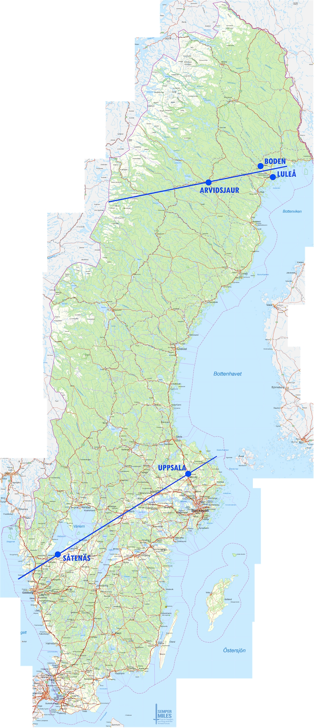 Kartskiss, linje mellan Boden/Luleå och Arvidsjaur samt Uppsala – Såtenäs
