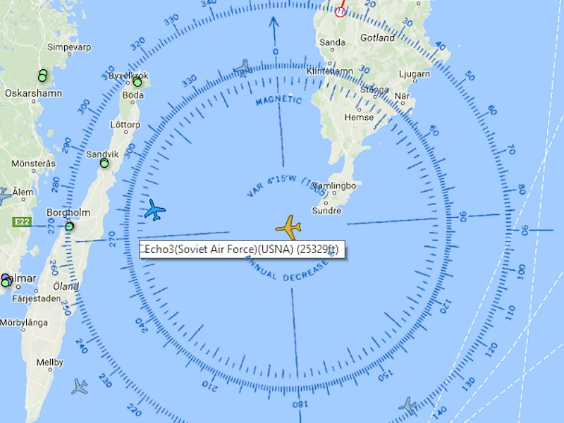 Under fredagkvällen upptäcktes ett sovjetregistrerat plan som växlade i höjd och kurs bland äkta, reguljärt passagerarflyg mellan Gotland och Öland, något vi inte alls själva hittat på. Man avvek dock snart efter en snabb men vänlig jaktinsats för identifiering.