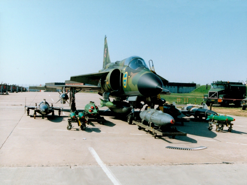 (Bilden: En Saab AJ 37 Viggen uppställd med beväpningsalternativ synliga. Från ett annat sammanhang. Bilden något beskuren. Foto: Okänd fotograf, Flygvapenmuseum, CC BY 4.0 https://creativecommons.org/licenses/by/4.0/deed.sv)